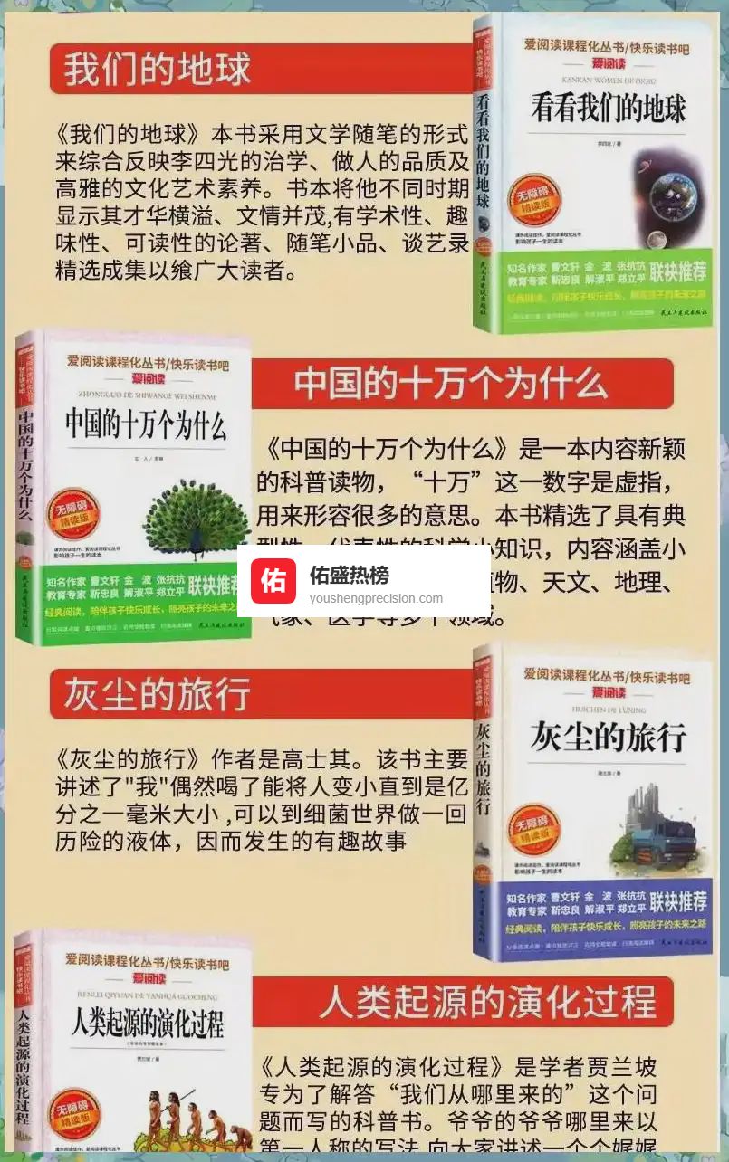 《十万个为什么》《看看我们的地球》《灰尘的旅行》《人类起源的演化过程》——科学+地理+自然+历史一网打尽;再附赠几本同龄人好评的“彩蛋”,助娃打开更广阔的阅读宇宙。