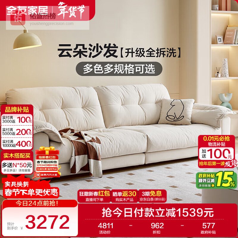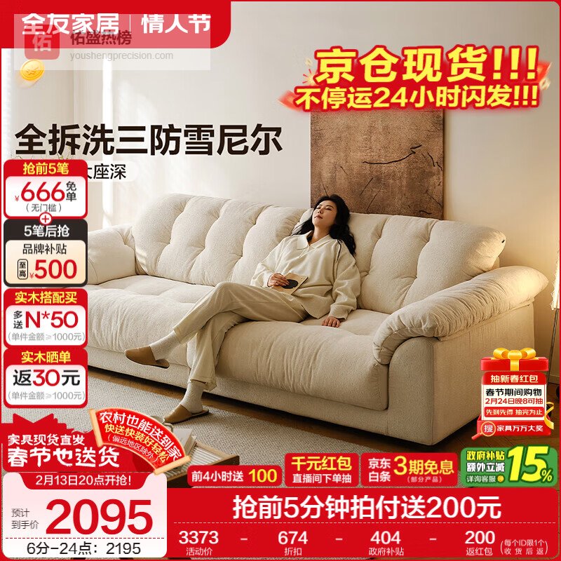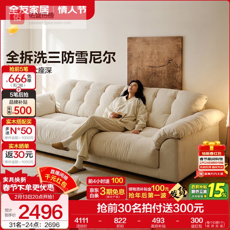 全友家居现代简约云浪沙发客厅可拆洗布艺沙发小户型2025新款直排沙发 【京仓闪发 | 常规款 | 三防雪尼尔】云絮白 | 2.7m 母婴可接触面料+全拆洗+白鹅毛+加大坐深¥