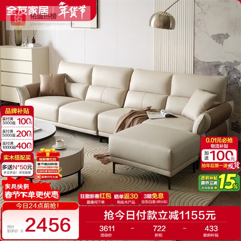 全友家居 现代简约布艺沙发客厅家具小户型家用贵妃位L型布艺转角沙发¥