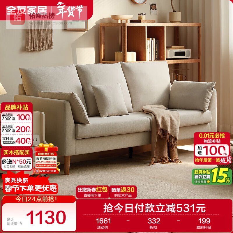 全友家居现代简约家具布艺沙发小户型家用卧室客厅实木脚三人位沙发¥
