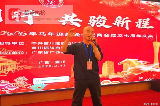 2026年2月13日,广东省广西富川商会在富川县美豪丽致酒店隆重举行2026马年迎新晚会暨商会成立七周年庆典。这是富川商会成立七年来,首次将年会主场设在家乡富川,县委统战部相关领导、县工商联负责人、兄弟商协会代表、企事业单位嘉宾及社会各界人士约200人齐聚一堂,共叙乡情、共谋发展。