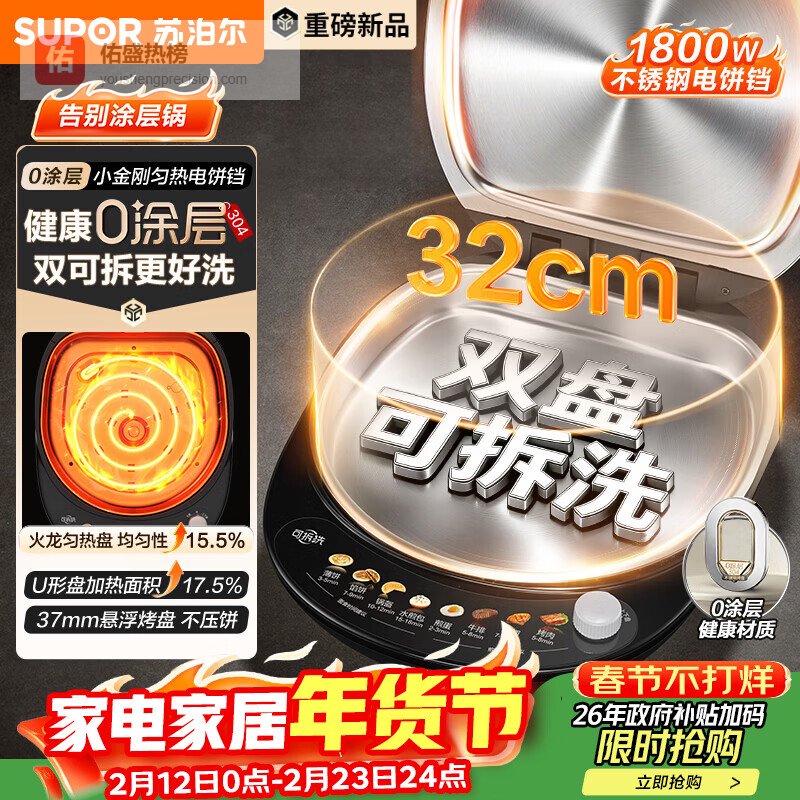 苏泊尔(SUPOR)电饼铛 0涂层不锈钢304 上下盘可拆洗 电饼档家用 煎饼锅烤肉锅 烙饼锅早餐机煎烤机 JJ32RG832¥