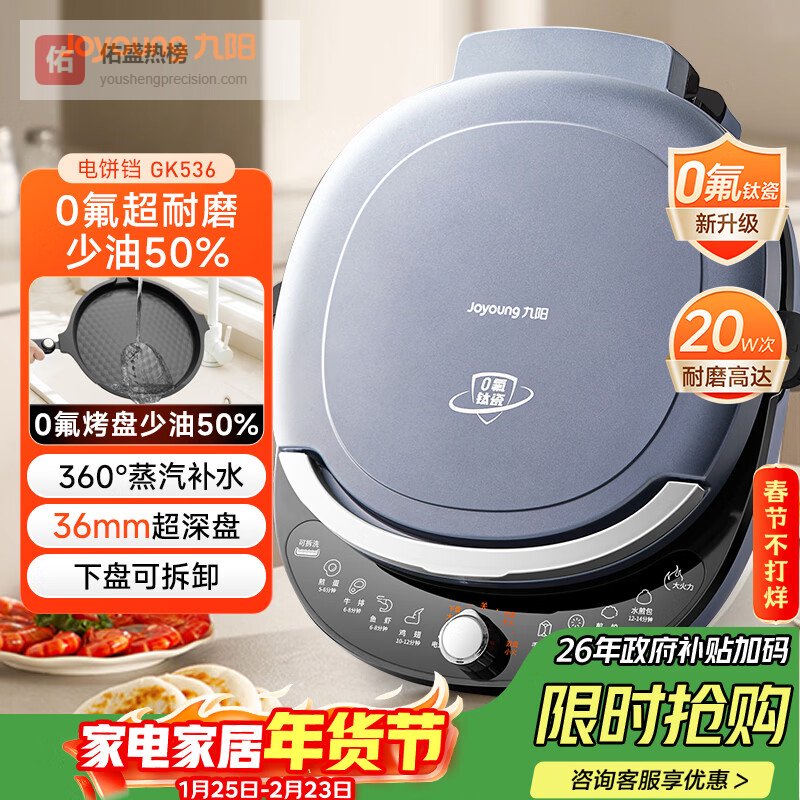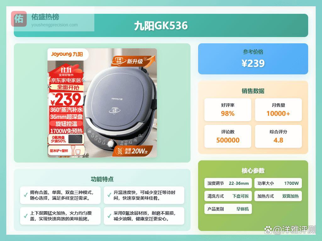 第1款:九阳GK5361️⃣ 双面均匀加热:这电饼铛用的是上下双圈加热,而且功率有1700W,火力特别猛!这样煎东西的时候,受热就很均匀,速度也快,不用在那儿干等,几分钟就能搞定。