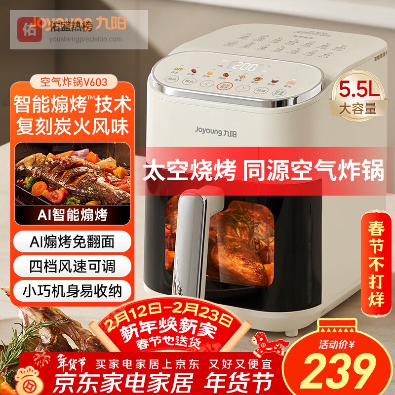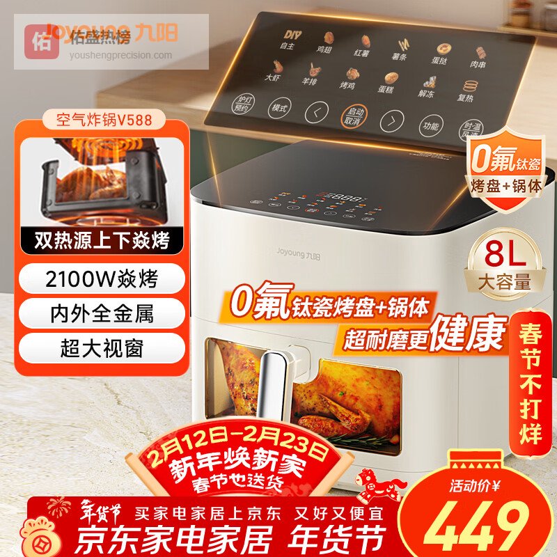 九阳(Joyoung)空气炸锅家用焱烤双热源 内外全金属炎烤8L大容量可视大视窗4档风速可调 煎炸蒸烤一体免翻面V588¥