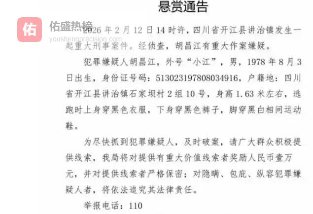 为凝聚社会力量,尽快将嫌疑人抓获归案,2月13日,开江县公安局正式发布悬赏协查通告,清晰列明胡昌江的体貌特征、着装信息及户籍地,明确承诺凡是提供真实有效线索、直接协助警方抓获嫌疑人的市民,将获得1万元人民币现金奖励。