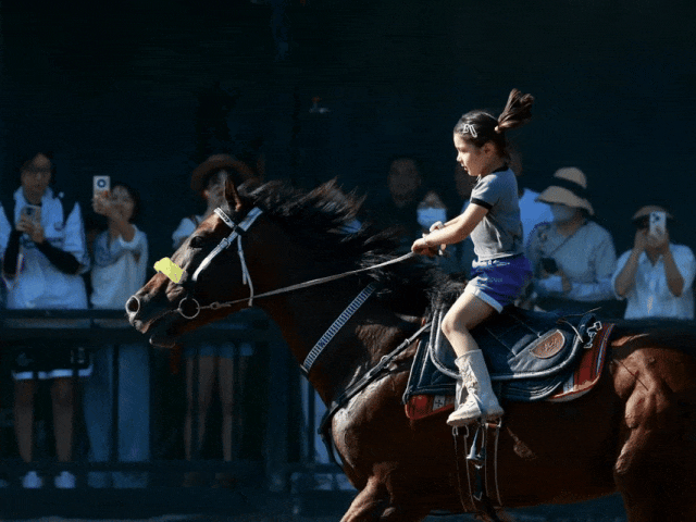 ▲在位于乌鲁木齐的新疆野马集团汗血马基地,夏克拉在为游客表演(2025年7月23日摄)。 新华社记者 王菲 摄