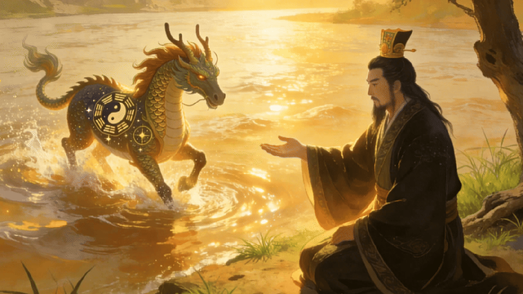 ▲“龙马负图”出于河。AI生成