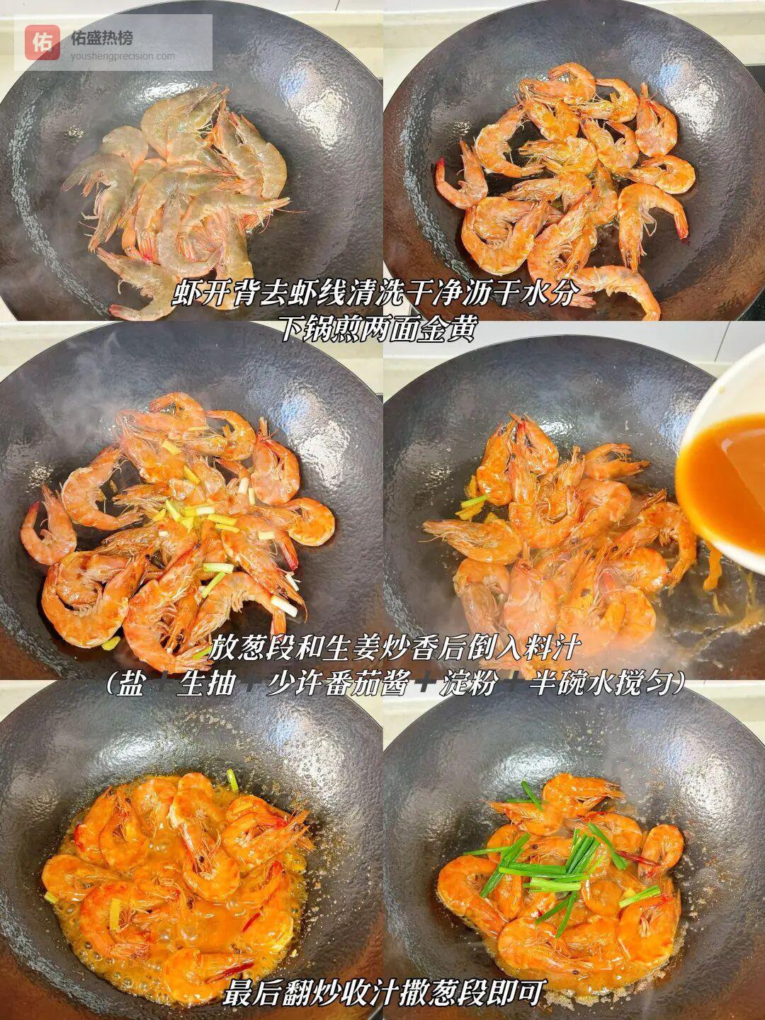 大虾(鲜虾最好)300-400克、生姜一小块(切丝)、大葱一段(切丝)、大蒜2瓣(切片)、番茄酱2大勺、料酒2勺、生抽1勺、白糖1勺(重要!)、盐少许、清水小半碗、食用油适量。
