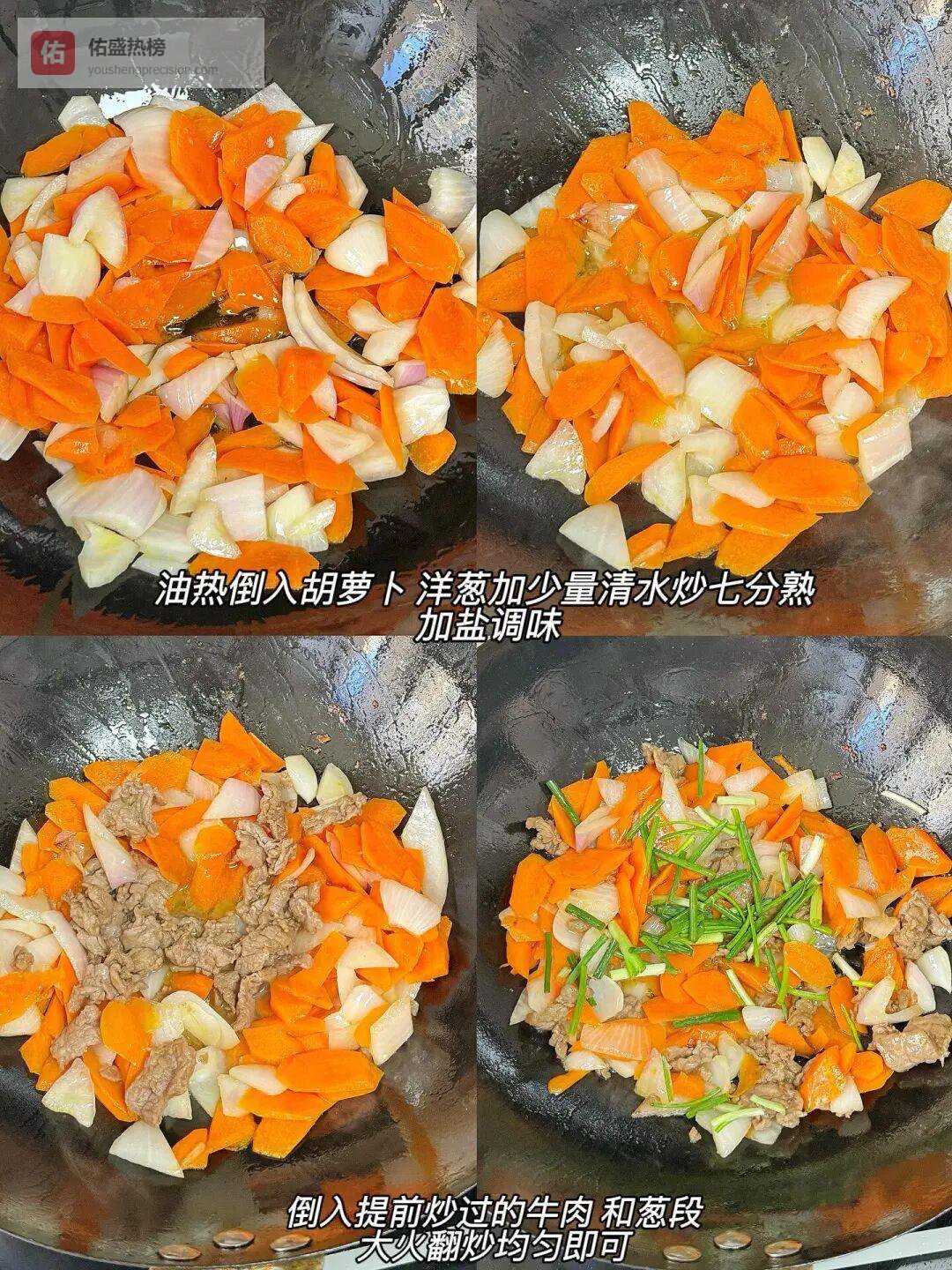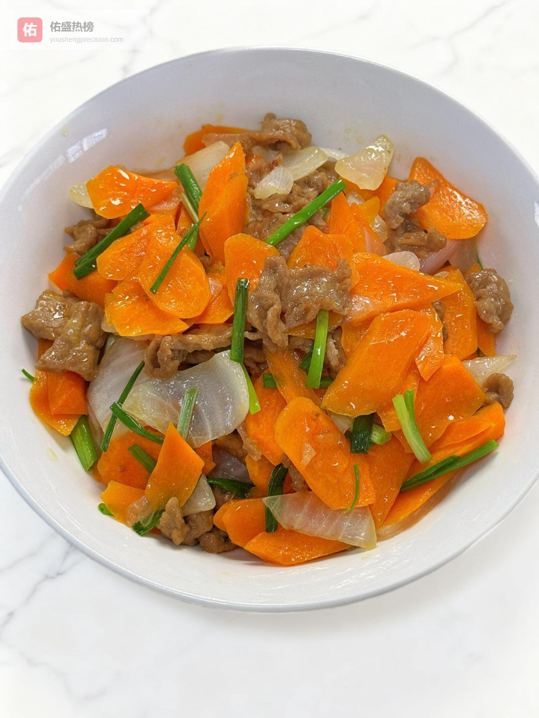 ○ 合二为一,快速出锅: 看到胡萝卜炒软后,倒入之前滑好的牛肉,加入半勺老抽调色(没有可不加),快速翻炒均匀。如果加了青椒或蒜苗,这时候也一起倒进去,翻炒至断生。最后,尝一下味道,因为牛肉腌制时已经有底味,所以根据情况酌情加盐。翻炒几下,让所有味道融合,就可以装盘啦!整个过程行云流水,不超过15分钟,一道美味又健康的菜就搞定了。