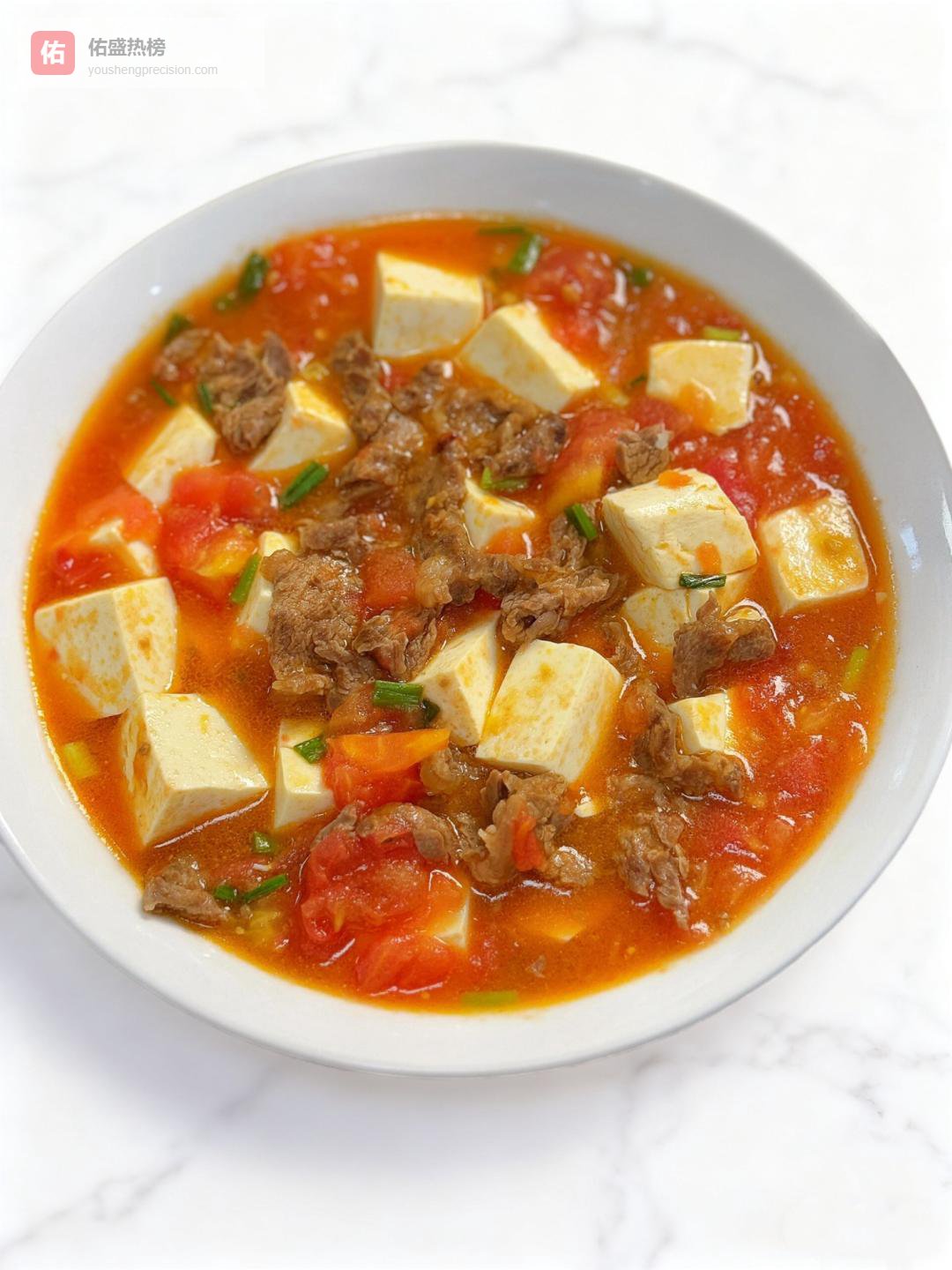 牛里脊肉150克、嫩豆腐(南豆腐)一块、番茄2-3个(中等大小)、生姜一小块(切末)、香葱一根(切葱花)、生抽2勺、料酒1勺、蚝油1勺、玉米淀粉1勺(分两次用)、番茄酱1勺(增加风味)、盐适量、白糖少许、白胡椒粉少许、食用油适量。