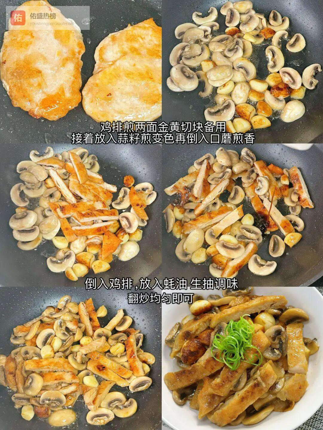 ○ 煎出金黄和香气: 平底锅烧热,倒油。油热后放入腌好的鸡胸肉,用中火煎。一面煎到金黄后,翻面继续煎,两面都金黄后,把鸡胸肉推到锅的一边,或者先盛出来备用。不用洗锅,直接把蒜瓣倒进锅里,用煎鸡胸的油把蒜瓣煎到表面微黄,散发出浓浓的蒜香。接着放入口蘑片,和蒜瓣一起翻炒,直到口蘑变软出水。