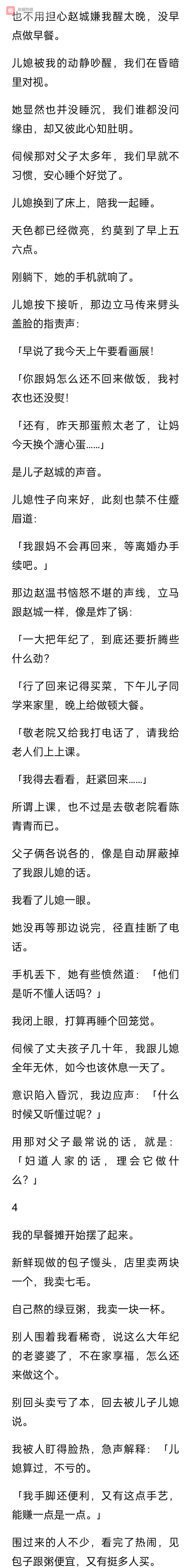 那晚我们喝完了那瓶酒。 窗外的月亮很亮,我跟儿媳说了很多话。 我说我这辈子,头一回觉得,晚上睡觉之前,不用想着明天早上做什么早饭,心里是踏实的。
