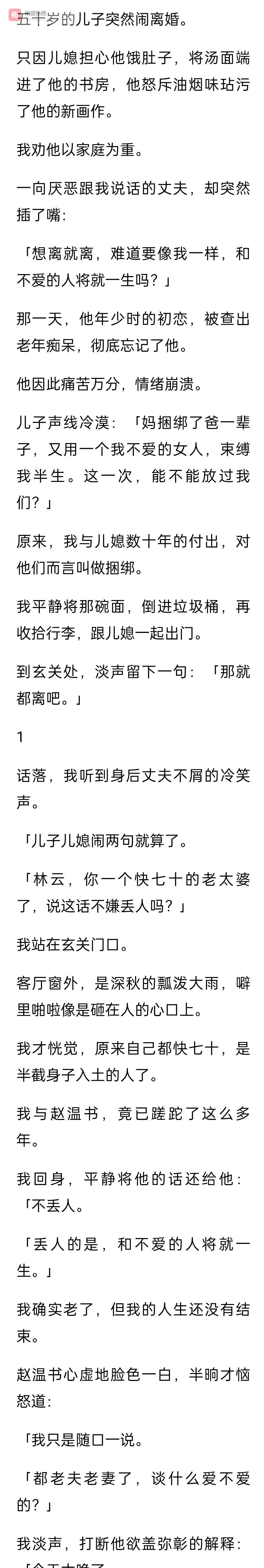 然后我转过身,对着满院子目瞪口呆的老人,对着我那结婚五十年的丈夫,对着我那十月怀胎的儿子,对着那个我伺候了他们五十年的家,说了一句话。