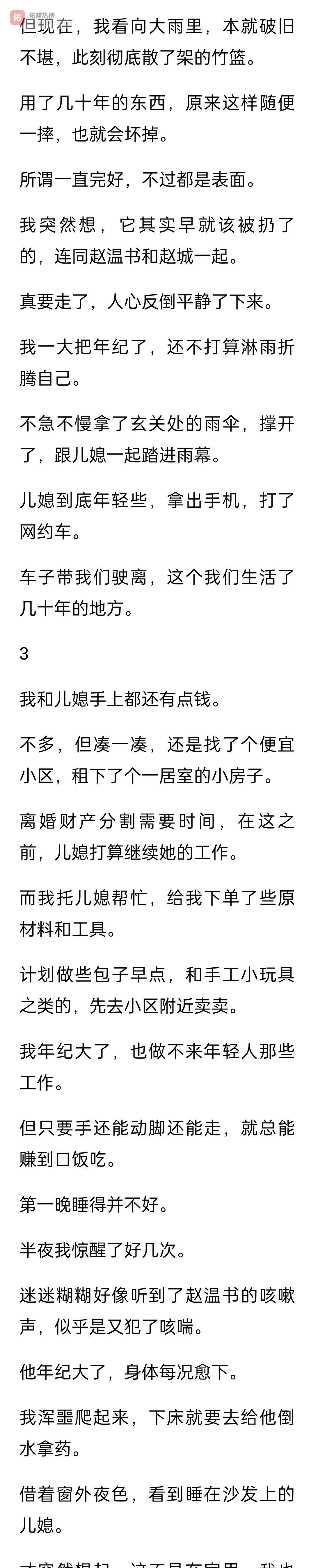 他急了,追上来,步子又快又喘。 他有心脏病,受不得刺激。 以前每次这样,我都赶紧停下来扶他坐下,端水拿药。 伺候了几十年,就是条狗,也该念我点好吧?