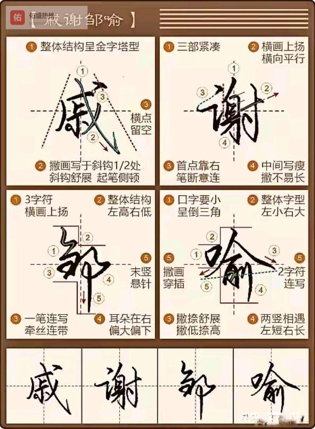 “谢”是三部结构,要注意“言”“身”“寸”紧凑排列,横画微微上扬,练会了“谢”,“繁”“凝”“餐”这些字就有了“章法”;