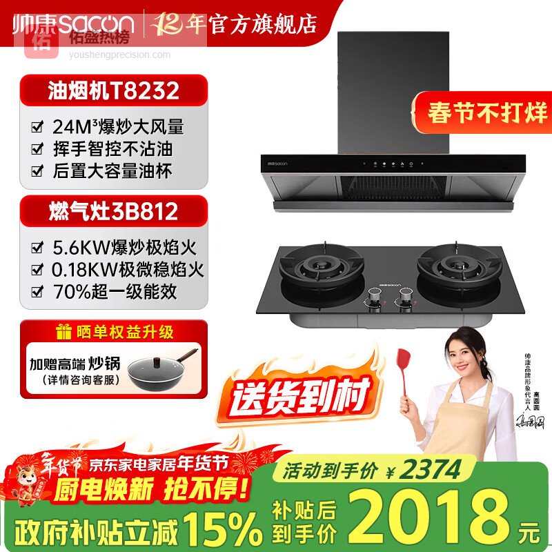 帅康(Sacon)欧式顶吸抽油烟机T8232/T8233家用大吸力挥手智控烟机 灶具套装可选 烟机+极焰火灶3B812 液化气(具体火力详询客服)¥