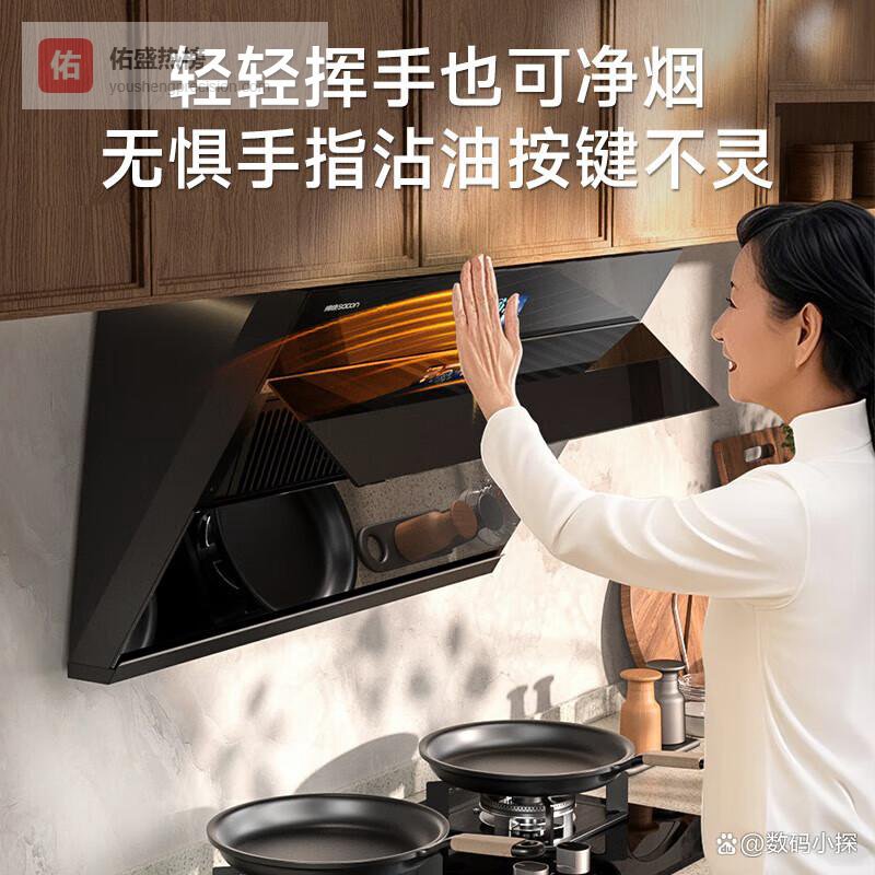 它采用超薄机身设计,节省空间,融入厨房整体风格,外观时尚还易于清洁。配备风轮直径达27cm,增强吸力,还支持挥手智控,操作更加便捷,即使双手油腻也能轻松调节。同时,自清洁功能配合90秒延时关机,帮助自动清除油污,维护更省心。
