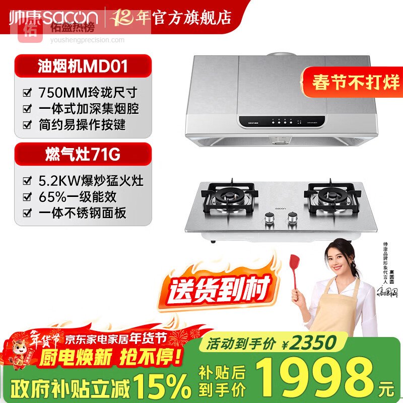 帅康(Sacon)750mm/700mm小尺寸顶吸中式脱排抽油烟机MD01/M8303家用大吸力烟机 灶具套装可选 MD01烟机+71G不锈钢灶 天燃气¥
