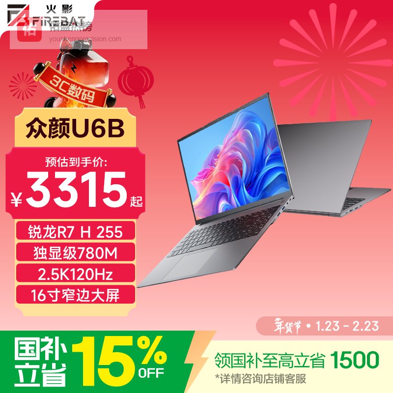 【京东自营】火影U6B锐龙7高性能轻薄本办公商务本游戏本笔记本电脑R7-H25524G1TB2.5K¥