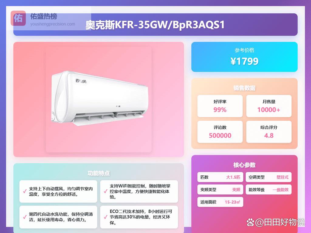 点评:奥克斯这款空调是一级能效,冲着省电去的选它肯定没错。而且它还带ECO节能模式,据说晚上睡觉能更省电,白天用也感觉电表走的慢了点。