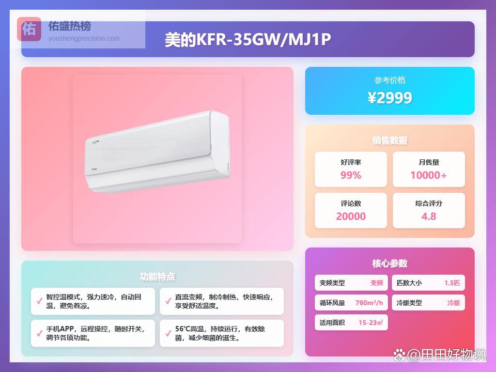 点评:美的这款空调用的是AI酷省科技,号称24小时持续节能,节能率能到25%。而且它会智能调节温度,给你一个26°C的舒适温度曲线,避免忽冷忽热,体验还不错。