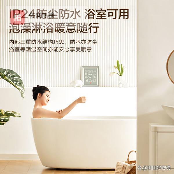 它防水防尘这个必须点赞,IP24级防水,浴室也能用,再也不怕洗澡冻感冒了。不光能触屏操作,还带遥控器,躺在床上就能调温度,温度范围5-35℃,晚上睡觉用也舒服。