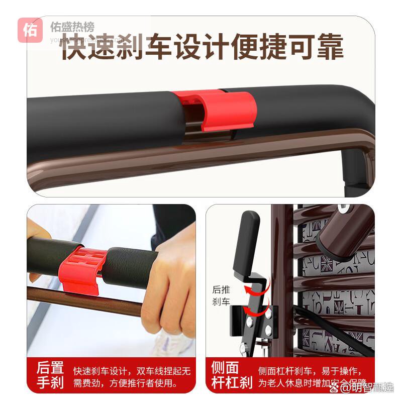 安全性是出行的重要考量,采用双刹车系统,包括杠杆刹车和手刹,确保佩戴老年人的安全万无一失。加之坚固耐重的三角加固设计,使得购物车在各类地形上都能稳定行驶,让您无忧出行,尽享生活乐趣。