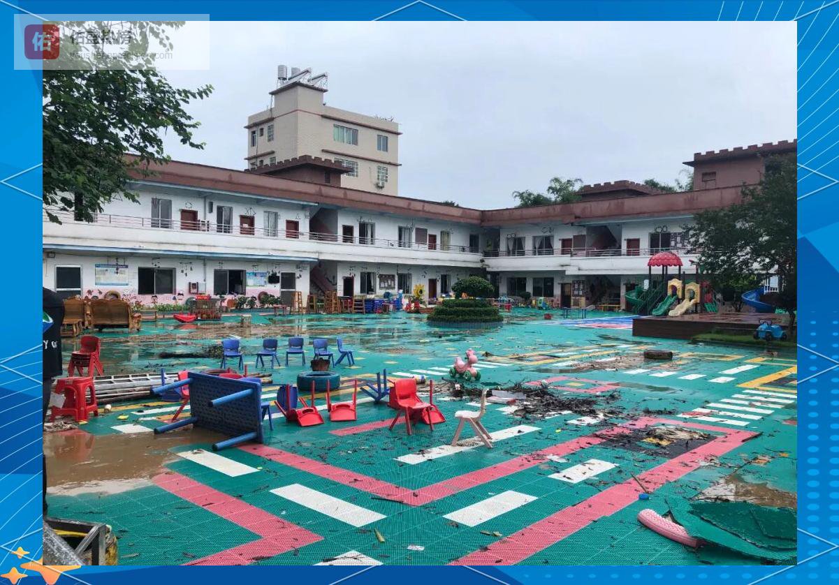 洪水淹过一楼窗台,课室桌椅、墙饰、地坪与游乐设施全部浸泡。幼儿园老师脚穿水鞋、手拿高压水枪,第一时间返岗清淤。负责人透露,118名师生已全部安全转移,接下来需重新购置教学设备。
