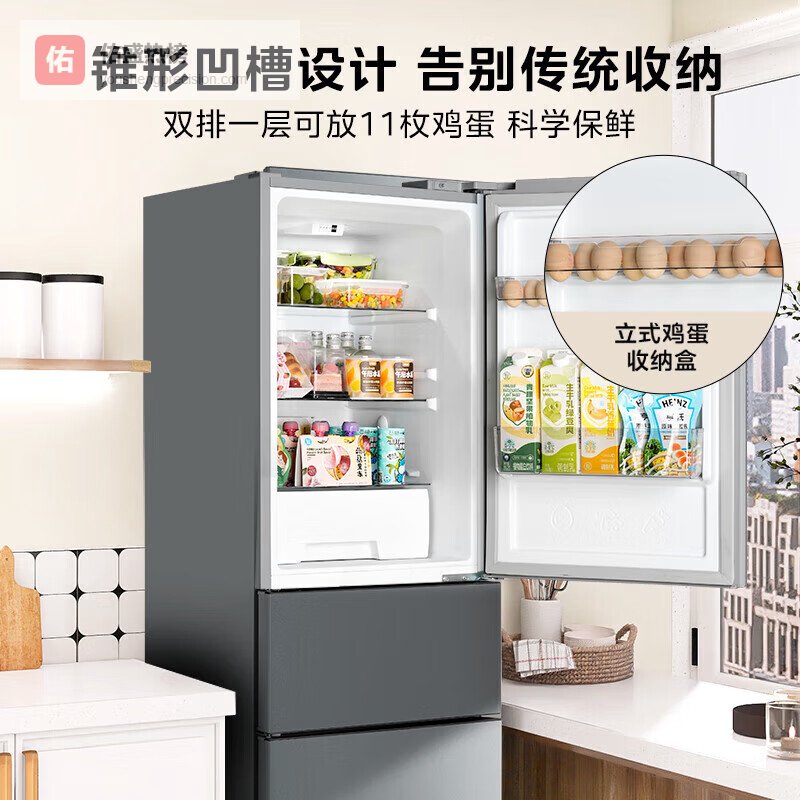 当清晨的阳光透过厨房纱帘,打开这台213升华凌三门冰箱的瞬间,就像掀开一个精心设计的收纳剧场——上层冷藏区用可调节层架托住牛奶盒和果酱瓶,中层软冷冻区让牛排保持最佳解冻状态,下层冷冻室抽屉里整齐码放的速冻水饺与冰淇淋互不干扰。