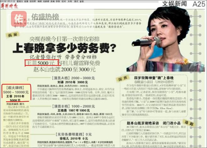 而且她的这份用心是不求回报的,有网友翻出了春晚早年的出场费,发现春艺人报酬很低。据悉,春晚报酬一共分为四个档次,王菲就是最高档。赵本山宋丹丹等老艺术家则是二档,可即便是王菲,也只能拿到5000元的报酬。可以说,来一次春晚,王菲是要亏钱的。