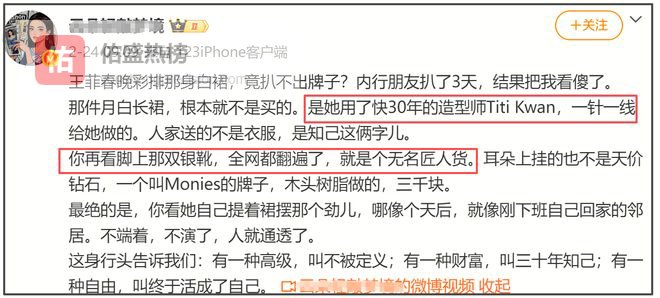 其实以王菲的咖位,她完全可以穿着大品牌给对方曝光度,实现双赢的局面。但她却选择了小众却费心的穿搭,足以看出她对春晚的用心。