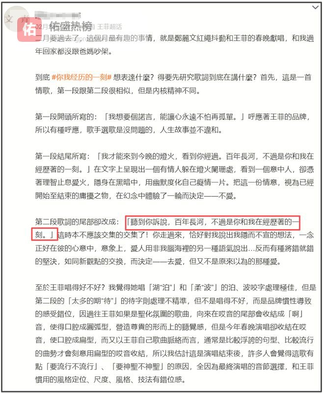 虽然王菲在春晚献唱后,乐评人斥责其假唱还难看,将她的唱功批判得一无是处。还有很多观众也直呼无法欣赏这首歌,也无法get王菲的唱功,甚至有人阴谋论,认为王菲是为了出场费以及之后的巡演才接下春晚。