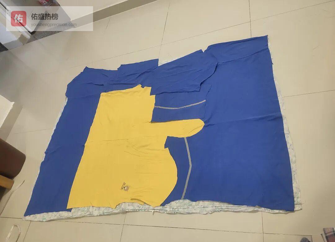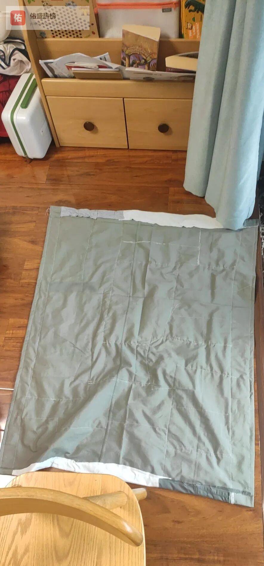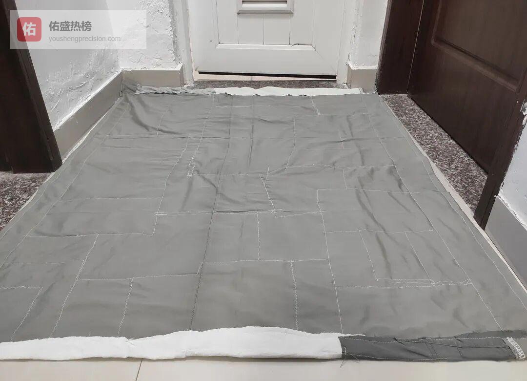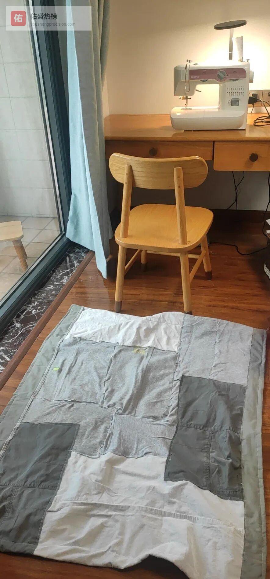 借来朋友的缝纫机,我俩轮班上阵。灰色地垫拼好轮廓后,我用胶枪把布块“固定”在底板上,防止轧片时移位;再返工补线,边缘更平整。蓝黄那块更干脆,直接一整块布料当背衬,踩两道直线就完工。