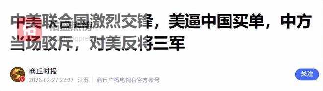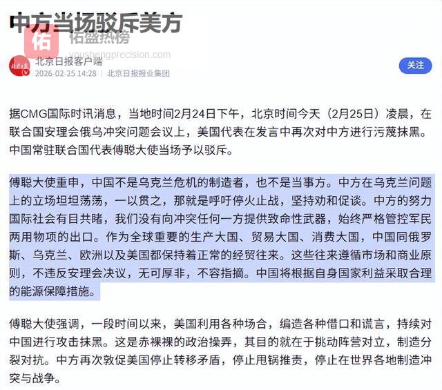 2026年2月25日,在庄严肃穆的联合国会议这一国际舞台上,逢俄乌冲突四周年,美方无端对中国横加指责,以子虚乌有之词恶意污蔑抹黑,将蛮横无理与霸权主义展现得淋漓尽致,这种妄图混淆国际视听的丑恶嘴脸暴露无遗。