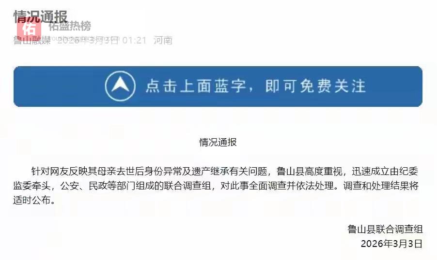 3月3日凌晨,鲁山县联合调查组正式通报介入调查,纪委监委、公安、民政等多部门联手,承诺"适时公布"结果。