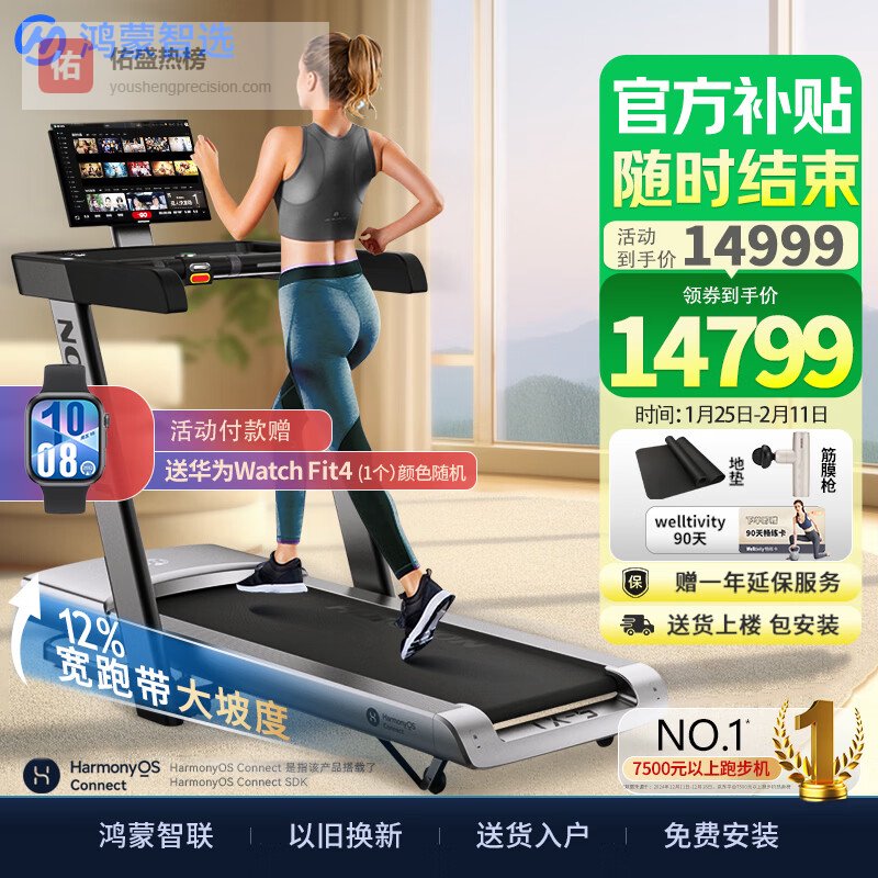 华为智选跑步机定位高端智能家庭健身市场,强调护膝减震、静音和互联功能。品牌理念是通过智能设备生态提供精准运动数据和个性化训练方案,实现高效居家健身体验。