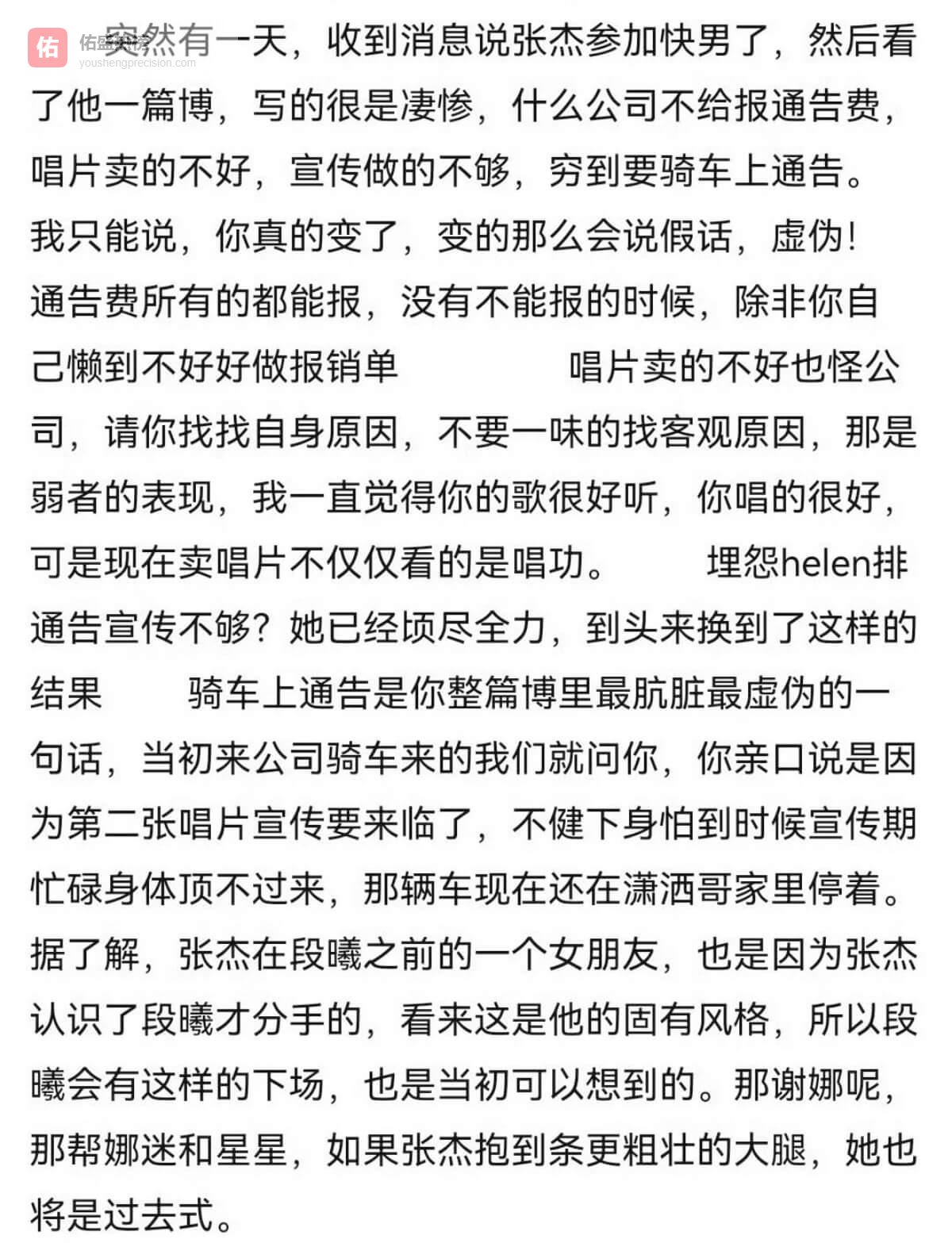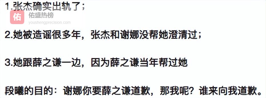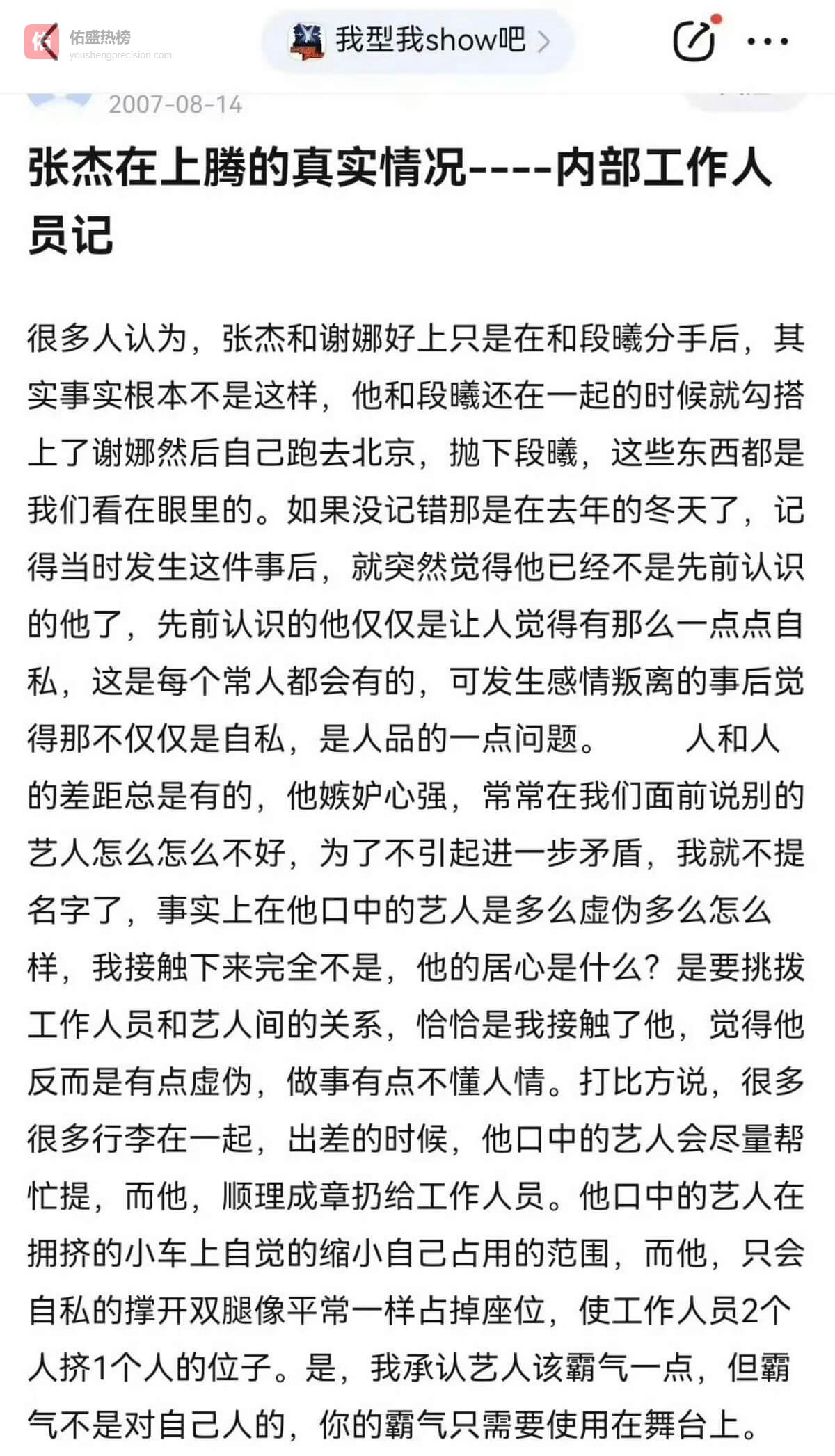 2007年就有自称是经纪公司工作人员发文,指控张杰的人品,当中就提及了张杰是因为谢娜才抛弃了段曦。