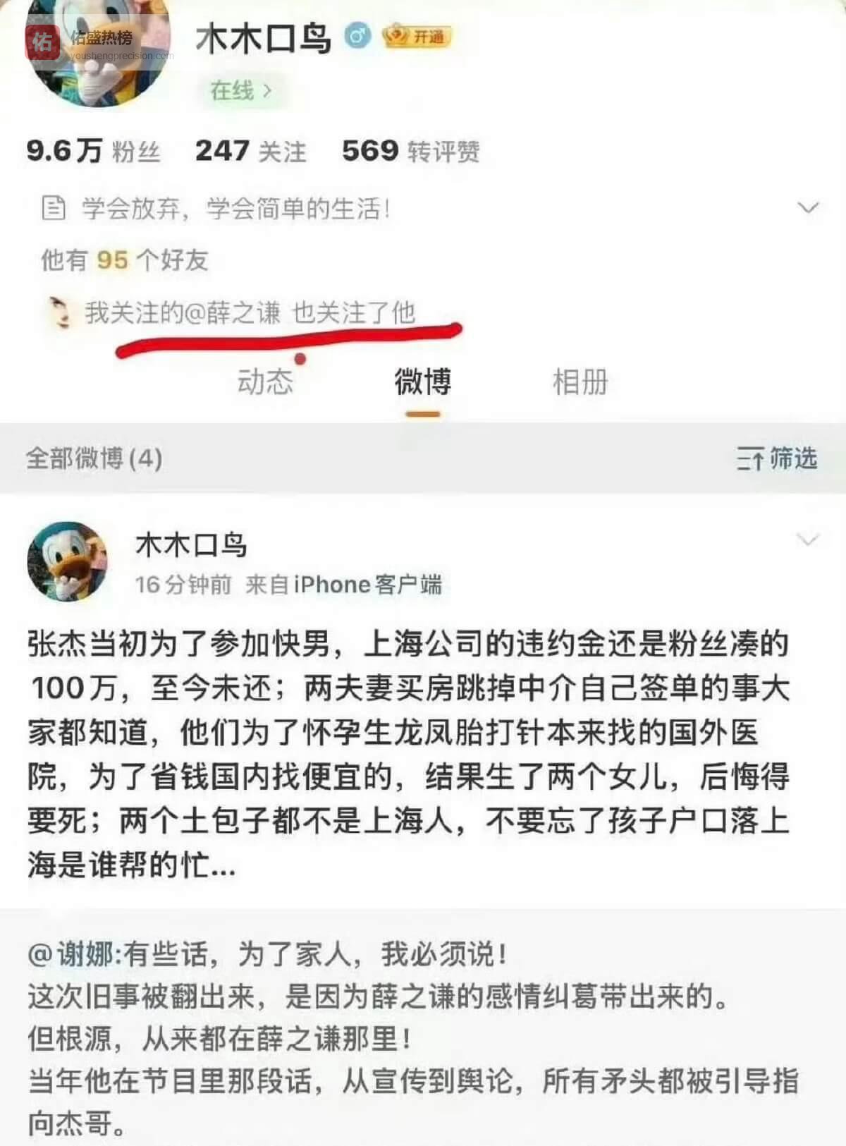 随后网友发现,与薛之谦互关的微博账号“木木口鸟”(被认为是其好友)随即发文,密集爆料张杰、谢娜夫妇的隐私,包括: