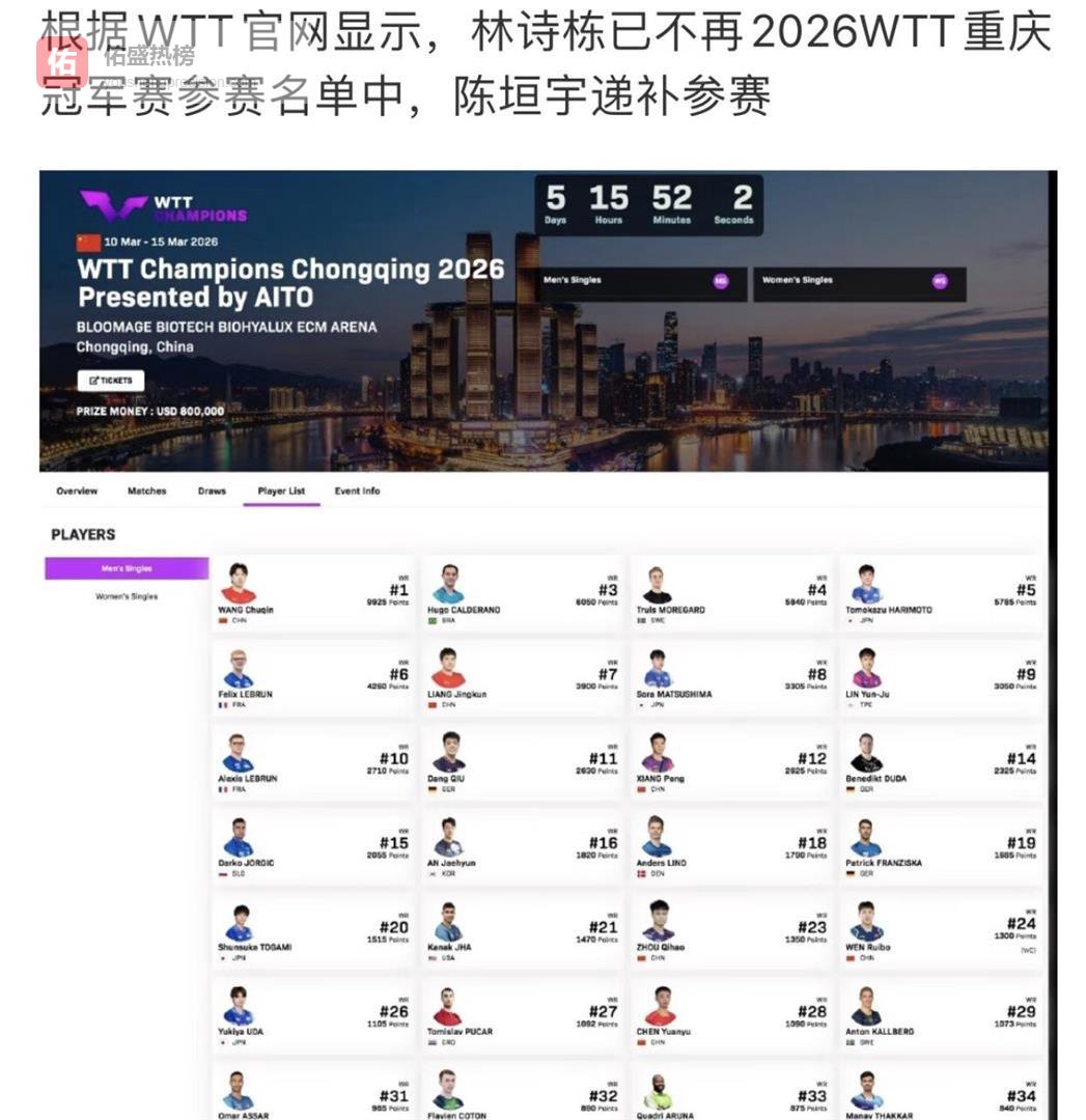 世界第三突然退赛?林诗栋放弃WTT重庆赛,提携+外卡再加3人,中国队最终名单出炉!王楚钦孙颖莎领衔全新14人阵容